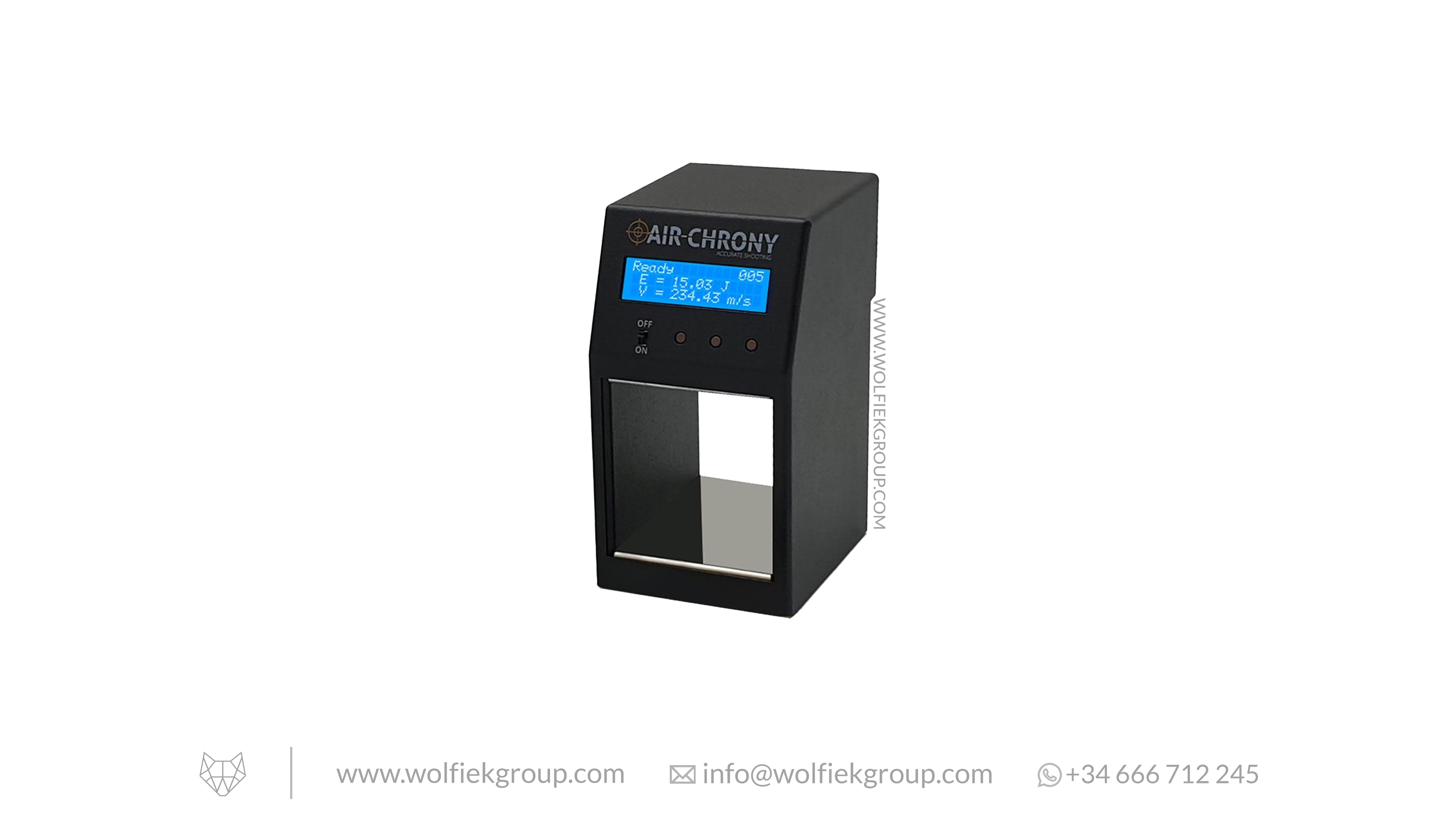 The chronograph measures bullet velocity up to 2000 m/s (6,562 fps), energy in Joules, average speed, maximal velocity, minimal velocity, number of shots, velocity deviation, cadence, and more. You can choose between metric or imperial units, and the language can be set directly in the menu.